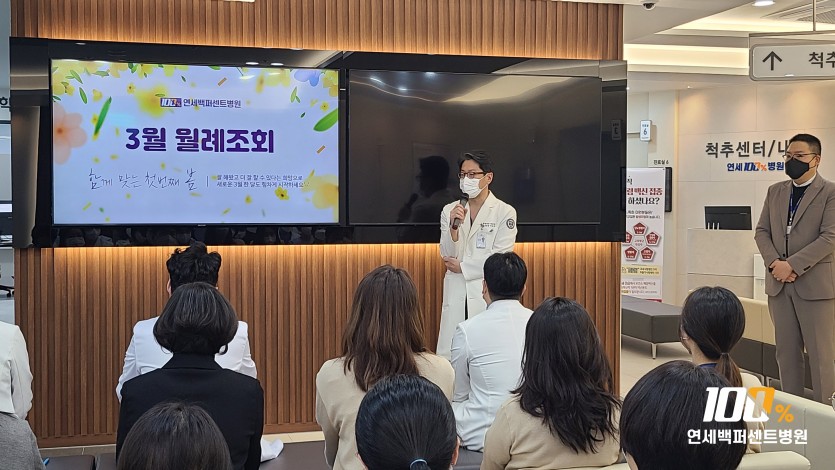 연세백퍼센트병원과 함께 하게 된 새로운 직원들을 소개하고 생일자 선물 증정 및 직원 시상의 시간을 가졌습니다. 지난 2월에 이어 영상을 통해 간단히 CS교육도 진행했습니다.