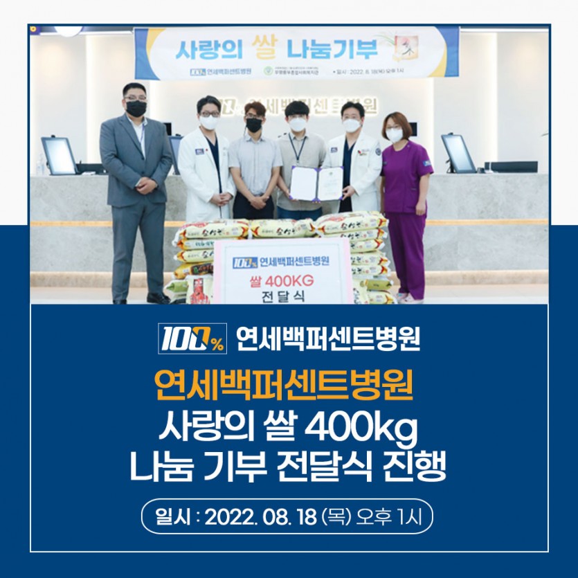 8월 18일(목) 연세백퍼센트병원에서 사랑의 쌀 400kg 나눔 기부 전달식을 진행했습니다.