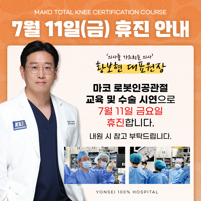 7월 11일 금요일 황보현 대표원장 휴진 안내 연세백퍼센트 0 552 06.30 15:34 7월 11일 금요일 황보현 대표원장 휴진 안내 안녕하세요. 연세백퍼센트병원입니다.황보현 원장님께서 마코 로봇인공관절 관련 학회 일정으로7월 11일 금요일 휴진합니다.진료 및 예약 참고하시어 내원에 착오 없으시길 바랍니다.감사합니다.