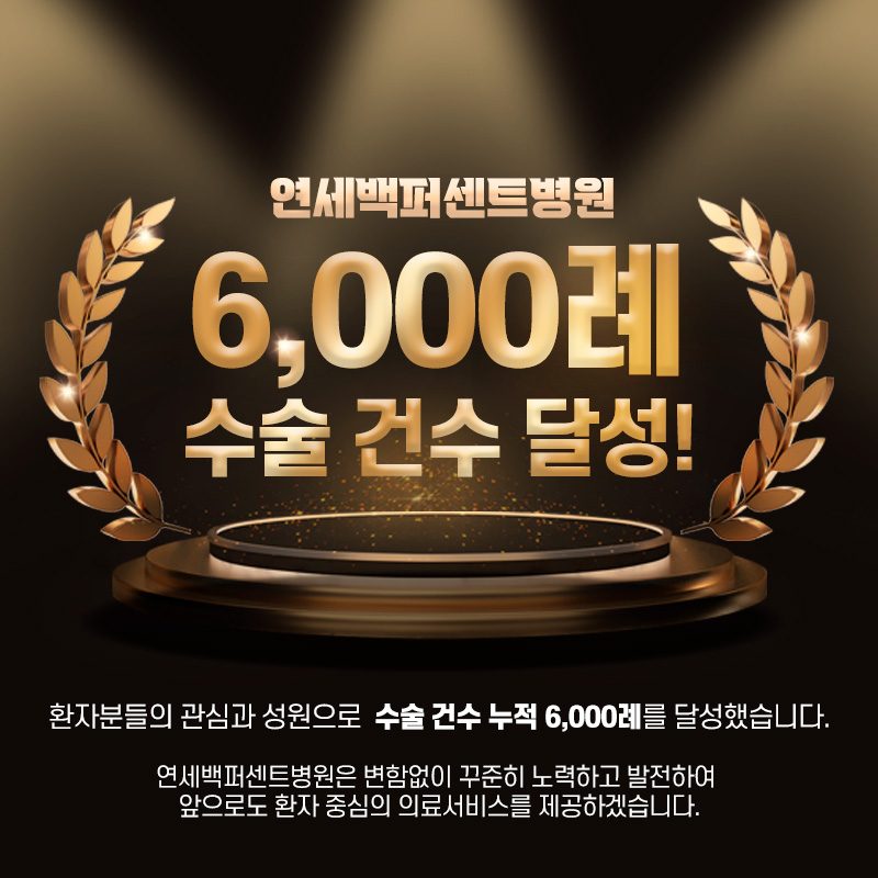 연세백퍼센트병원, 수술 건수 6,000례 돌파! 연세백퍼센트 0 443 08.18 16:35 안녕하세요. 연세백퍼센트병원입니다 :)환자분들의 믿음과 성원 덕분에연세백퍼센트병원이 어느새 수술 6,000례를 달성하였습니다.한 분 한 분의 건강 회복을 위해 최선을 다해온 시간이 모여이처럼 뜻깊은 성과로 이어질 수 있었습니다. 앞으로도 환자분들의 신뢰에 보답하기 위해최상의 의료 서비스와 더 나은 치료 환경을 제공하도록끊임없이 노력하겠습니다. 진심으로 감사드립니다.