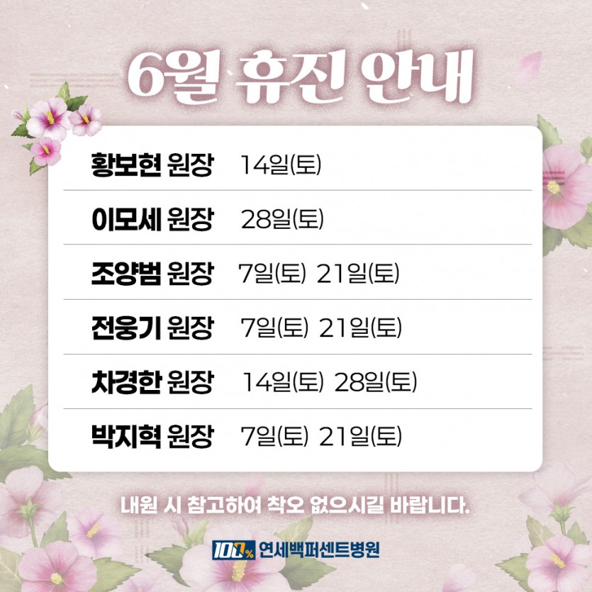 6월 진료 안내 연세백퍼센트 0 925 05.08 12:15 6월 3일 화요일 대통령 선거일 단축진료안녕하세요. 연세백퍼센트병원입니다.일정 참고하시어 내원에 착오 없으시길 바랍니다.유전전화(1533-1017), 홈페이지, 카카오톡, 네이버를 통해 예약 가능합니다.감사합니다.