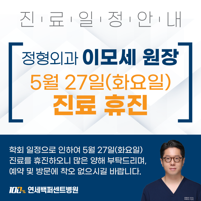 5월 27일 화요일 이모세 원장 진료 휴진 안내 연세백퍼센트 0 839 05.13 13:03 5월 27일 화요일 이모세 원장님 진료 휴진 안내 안녕하세요. 연세백퍼센트병원입니다.이모세 원장님께서 외부 학회 일정으로 인해5월 27일 화요일 진료 휴진합니다.진료 및 예약 참고하시어 내원에 착오 없으시길 바랍니다.감사합니다.