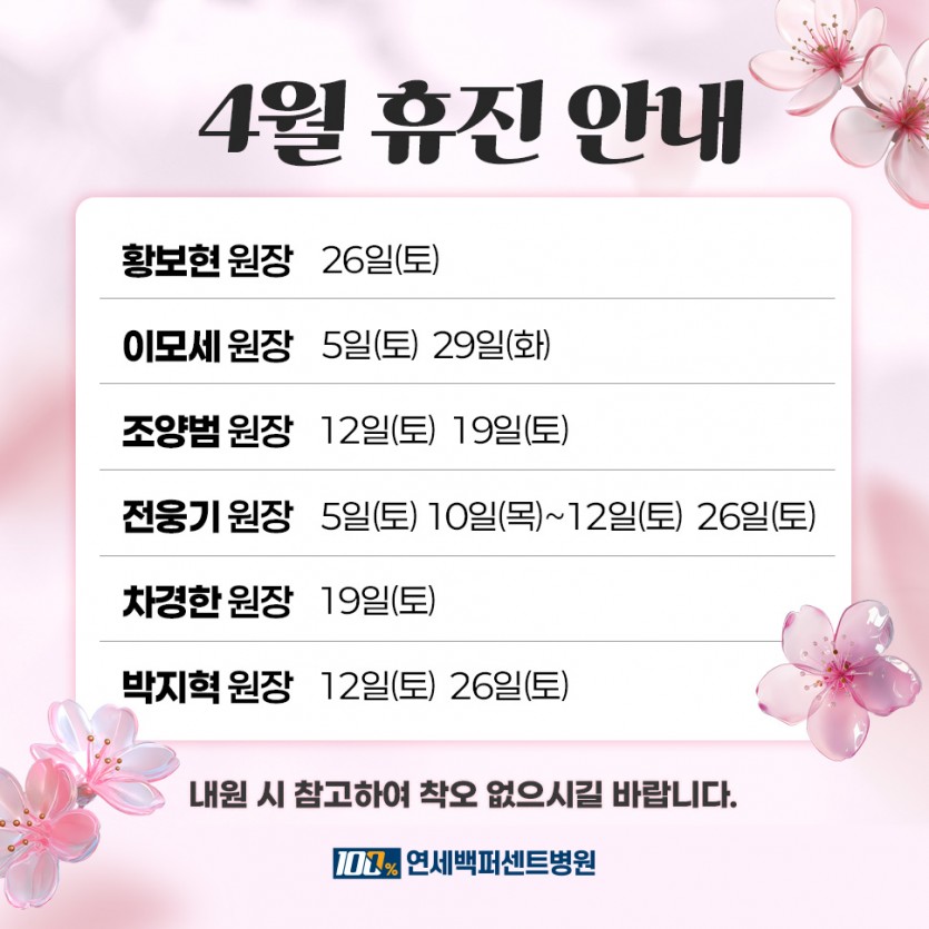 2025년 4월 진료 안내 연세백퍼센트 0 1075 03.12 09:46 2025년 4월 휴진 안내드립니다. 일정 참고하시어 내원에 착오 없으시길 바랍니다.홈페이지, 카카오톡, 네이버를 통해 온라인 예약도 가능합니다.감사합니다.