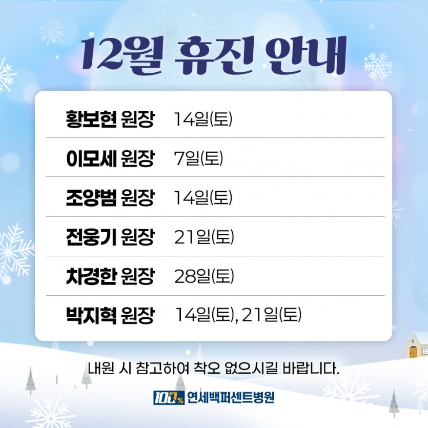 2024년 12월 진료 안내 연세백퍼센트 0 1695 2024.11.22 10:29 2024년 12월 휴진 안내드립니다.일정 참고하시어 내원에 착오 없으시길 바랍니다.유전전화(1533-1017), 홈페이지, 카카오톡, 네이버를 통해 예약 가능합니다.감사합니다.