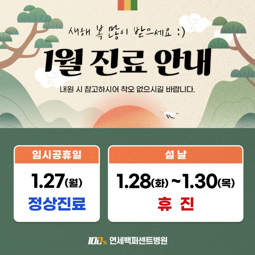 2025년 1월 진료 안내 연세백퍼센트 0 1578 2024.12.16 09:52 2025년 1월 휴진 안내드립니다.일정 참고하시어 내원에 착오 없으시길 바랍니다.유전전화(1533-1017), 홈페이지, 카카오톡, 네이버를 통해 예약 가능합니다.감사합니다.