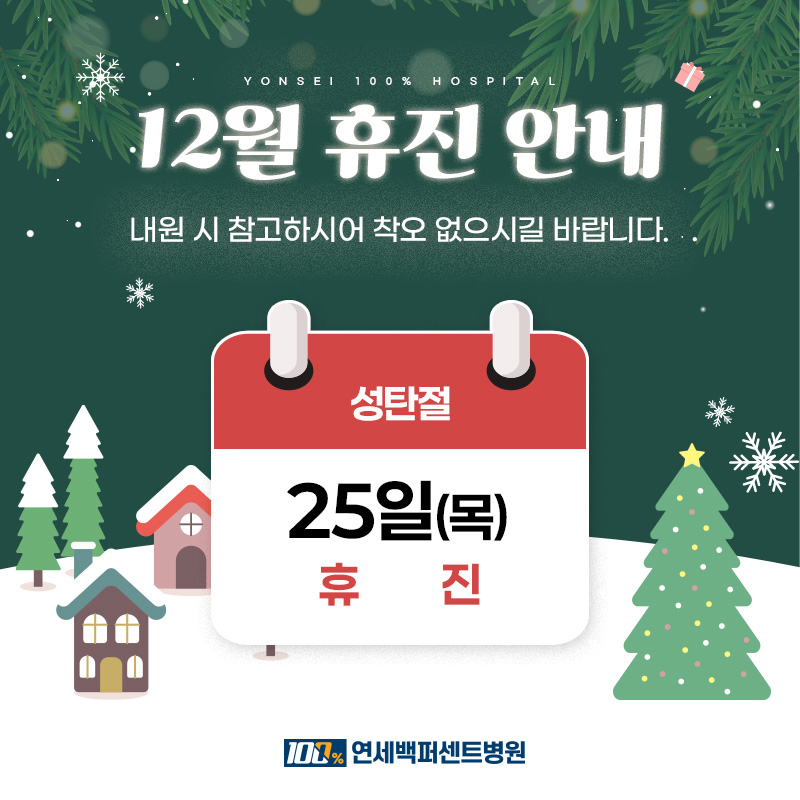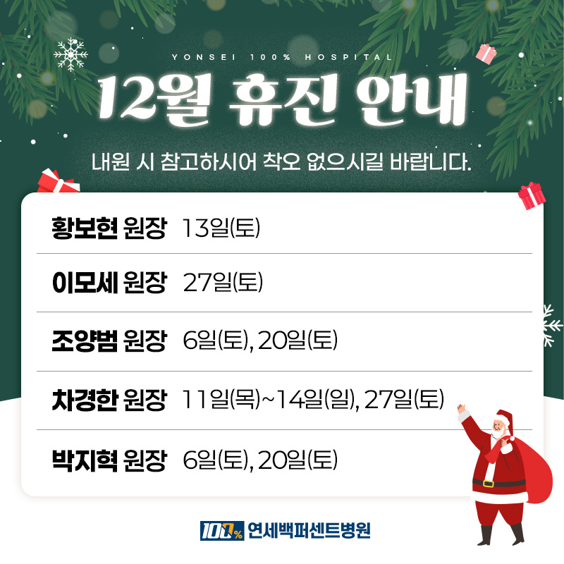 12월 진료안내 연세백퍼센트 0 29 11.17 10:36 안녕하세요. 연세백퍼센트병원입니다.12월 진료 일정과 의료진 휴무일 안내드립니다.일정 참고하시어 내원에 착오 없으시길 바랍니다.크리스마스(12/25 목요일) 휴무안전하고 따뜻한 연말 되시길 바라며, 앞으로도 최선을 다해 진료하겠습니다.