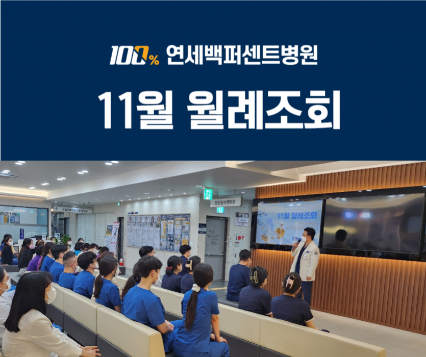 지난달 저희 연세백퍼센트병원의 새로운 가족이 된 직원분들 소개와 11월 생일을 맞이하신 선생님들의 축하를 시작으로 월례조회를 시작하였습니다.