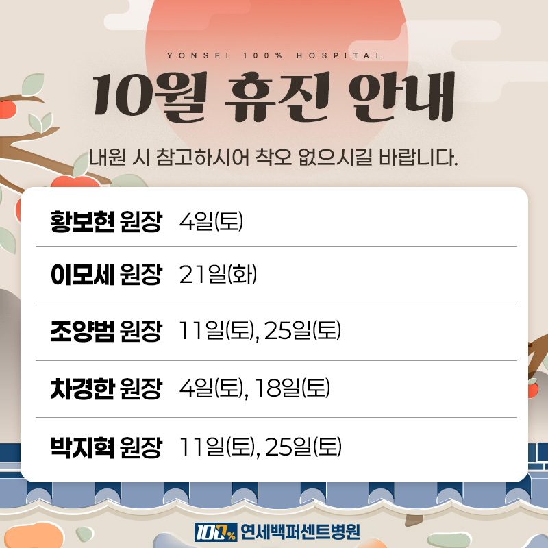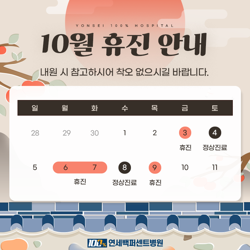 10월 진료 안내 연세백퍼센트 0 301 09.15 09:06 10월 휴진 및 진료 일정 안내해 드립니다.10/3(금) 개천절 휴진10/6(월)~10/7(화) 추석 당일 및 연휴 휴진10/9(목) 한글날 휴진10/4(토) 정상진료10/8 대체공휴일 정상진료참고하시어 예약 및 내원에 착오 없으시길 바랍니다.