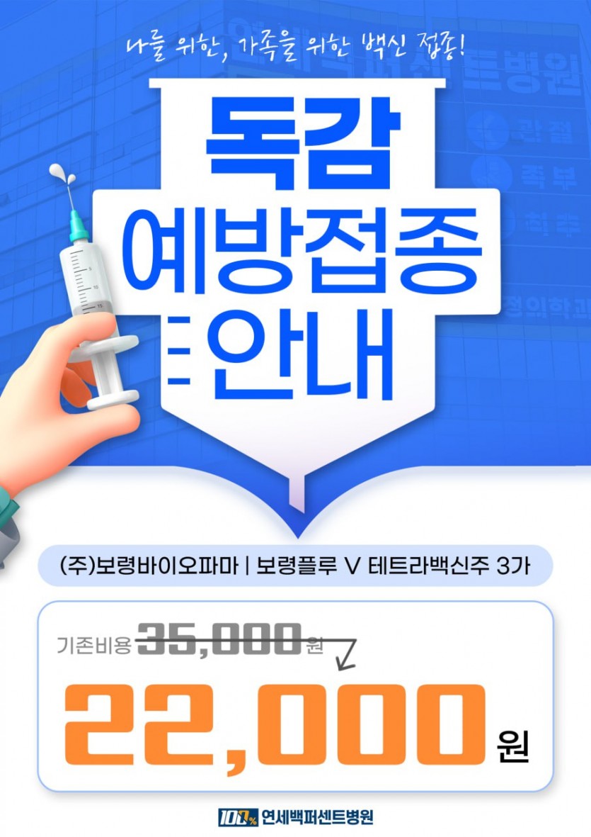 독감 예방접종 안내 연세백퍼센트 0 624 09.16 10:34 안녕하세요, 연세백퍼센트병원입니다.저희 병원에서는 독감 3가 백신 "보령플루 V 테트라백신주"를 시행합니다.궁금하신 부분은 홈페이지 또는 1533-1017에문의하시면 안내해드리도록 하겠습니다. 환자분들의 건강을 위해 노력하는 연세백퍼센트병원이 되겠습니다.감사합니다.