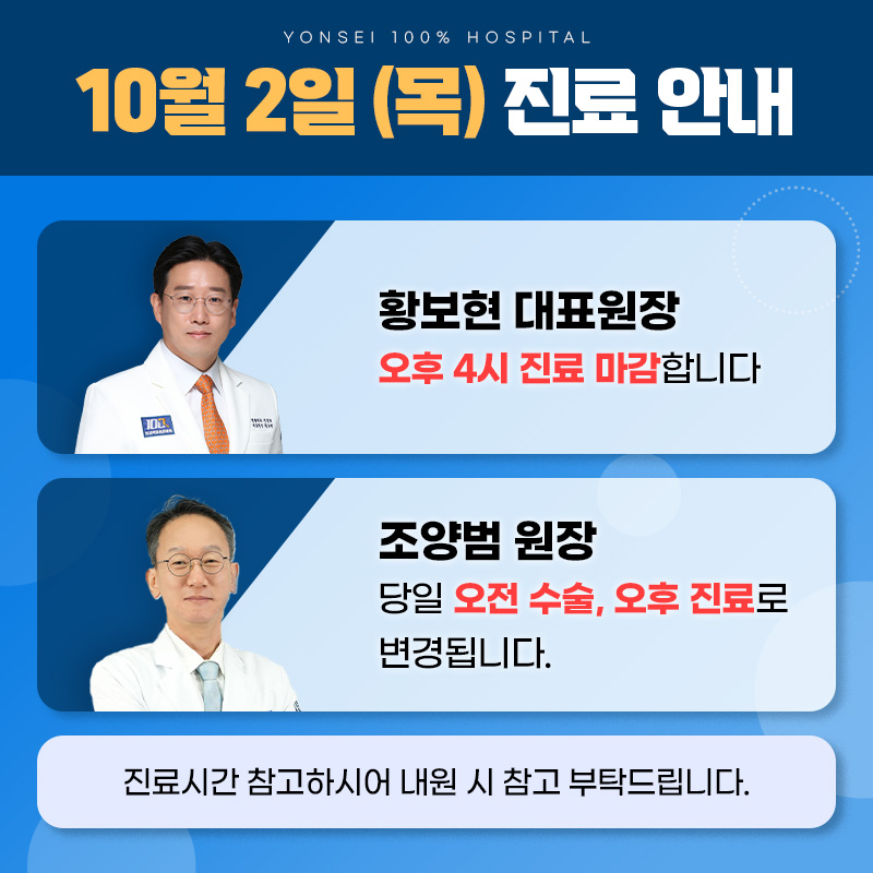 10월 2일 목요일 진료 시간 변경 안내 연세백퍼센트 0 236 09.23 14:34 안녕하세요. 연세백퍼센트병원입니다 :)10월 2일 목요일 진료 시간이 일부 변경되어 공지드립니다.황보현 대표원장 오후 4시 진료 마감조양범 원장 당일 오전 수술, 오후 진료해당 내용 참고하시어 예약 및 접수에 착오 없으시길 바랍니다.감사합니다.