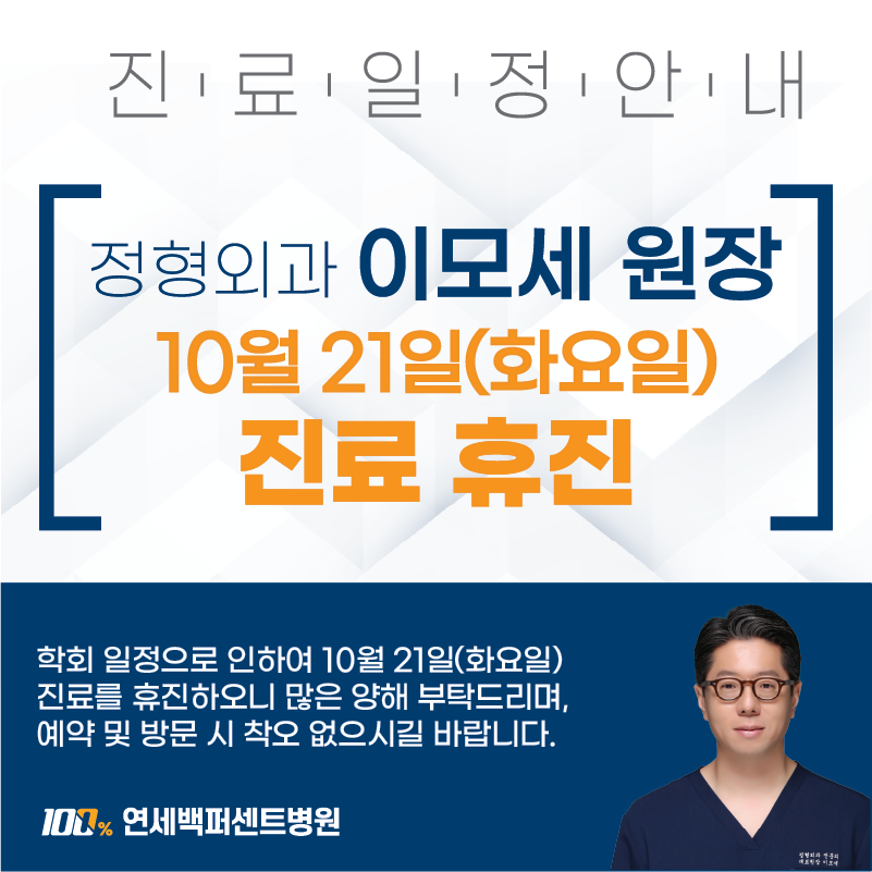 10월 21일(화) 이모세 대표원장 진료 휴진 안내 연세백퍼센트 0 170 10.14 10:03 10월 21일 화요일 이모세 대표원장 진료 휴진 안녕하세요. 연세백퍼센트병원입니다. 이모세 대표원장님이 외부 학회 일정으로 인해10월 21일 화요일 진료를 휴진합니다. 진료 및 예약에 참고하시어 내원에 착오 없으시길 바랍니다.