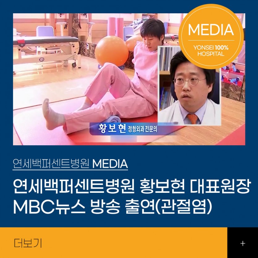 황보현 대표원장님, MBC 뉴스 출연(여성 관절염 남성의 4배 원인과 예방법은?) 최고관리자 0 1058 2022.08.04 15:17 지난 2012년 10월 12일 연세백퍼센트병원 황보현 대표원장님이MBC뉴스에 출연하셔서 관절염 예방법에 대해 설명해주셨습니다. 관절염은 적당한 운동으로 근력강화와 체중조절로 예방할 수 있으며,평지운동이나 자전거타기, 수영과 같은 운동으로 예방하기를 권장하셨습니다.
