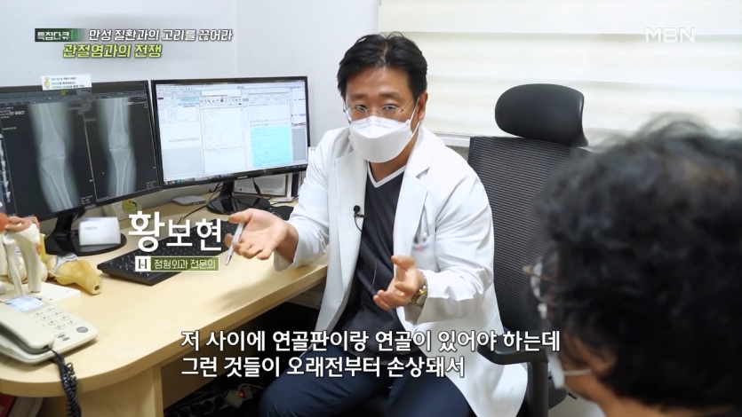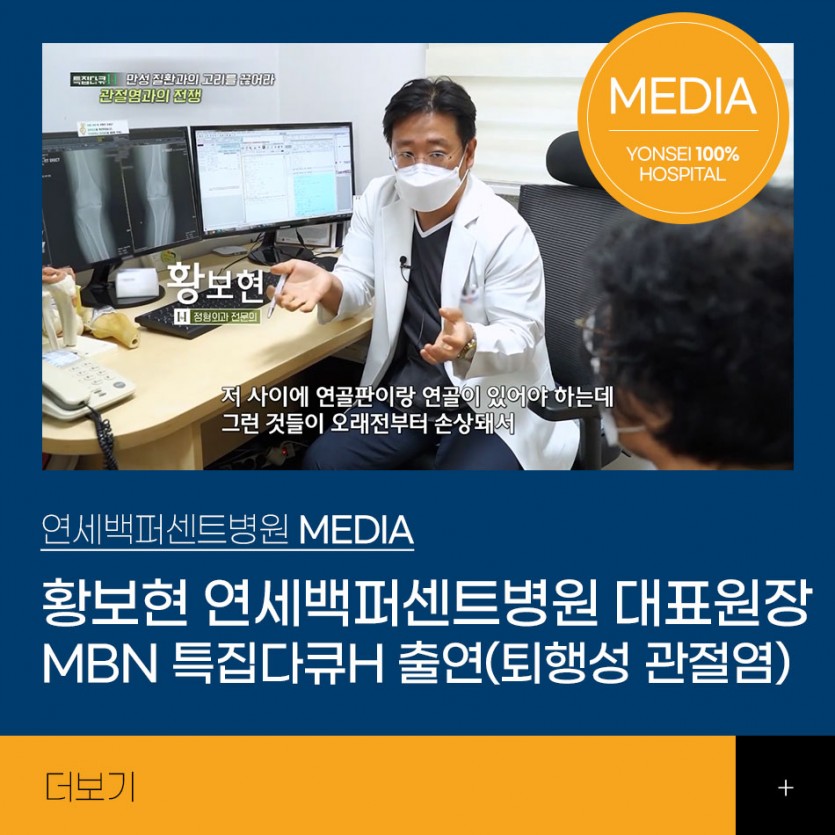 황보현 대표원장님, MBN 특집다큐H 출연(퇴행성 관절염) 최고관리자 0 1136 2022.08.08 16:47 지난 2021년 10월 2일 연세백퍼센트병원 황보현 대표원장님이MBN 특집다큐H에 출연하셔서 퇴행성 관절염에 대해 설명해주셨습니다. 퇴행성 관절염은 나이가 들면서 무릎을 구성하는 관절 연골, 연골판 등이손상되면서, 뼈하고 뼈 간격이 좁아지게 되고 뼈가 닳아서 염증과 통증이생기는 질환이라고 설명하셨습니다.