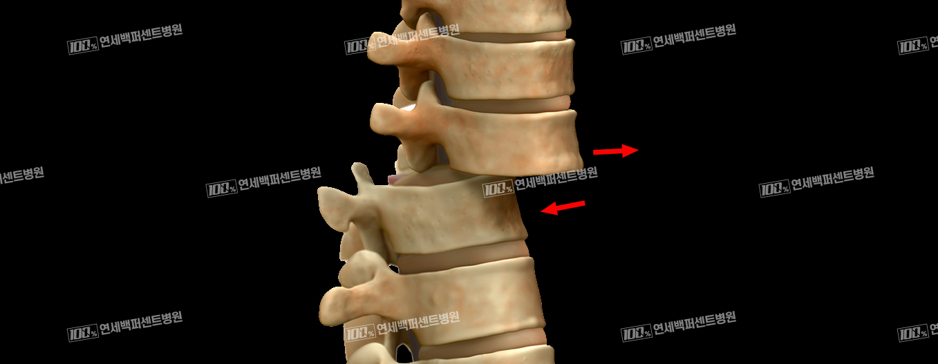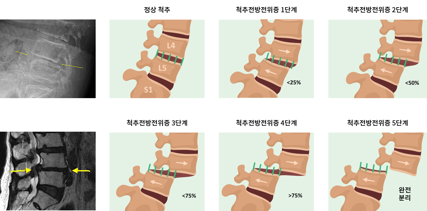 척추뼈의 위아래 마디가 어긋나게 되어 앞이나 뒤로 척추뼈가 미끄러져 나오는 질환입니다.