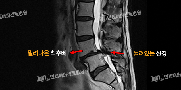 척추뼈가 밀리면 척추 신경을 보호하고 있던 척추뼈가 오히려 척추신경을 압박하여 통증, 하지방사통과 다리저림 등을 일으킵니다.