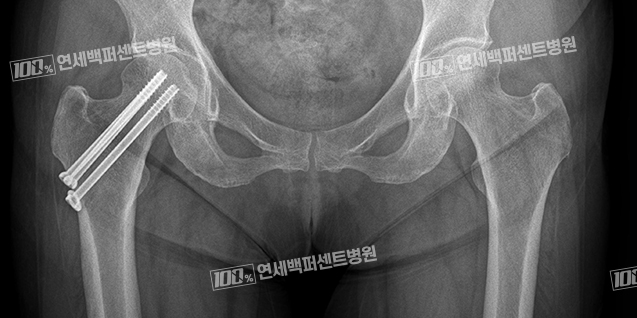 전자간 골절, 전위가 없는 급성 대퇴경부골절의 경우에는 골절 부위를 나사와 금속판 또는 골수정을 이용하여 고정하는 수술을 합니다.