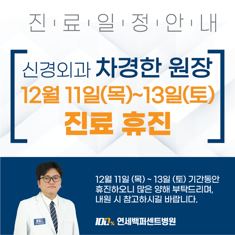 차경한 원장님 12월 진료 안내 드립니다. 연세백퍼센트 0 24 11.24 11:59 안녕하세요. 연세백퍼센트병원입니다.차경한 원장님이 12월 11일(목)~13일(토) 휴진하오니진료 및 예약에 참고하시어 착오 없으시길 바랍니다감사합니다.